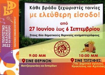 Κάθε βράδυ, έως τις 6 Σεπτεμβρίου και μια διαφορετική ταινία και πάντα με ελεύθερη είσοδο. Σας περιμένουμε όλους!«Σινέ Θερινόν» (Ματζαγριωτάκη...